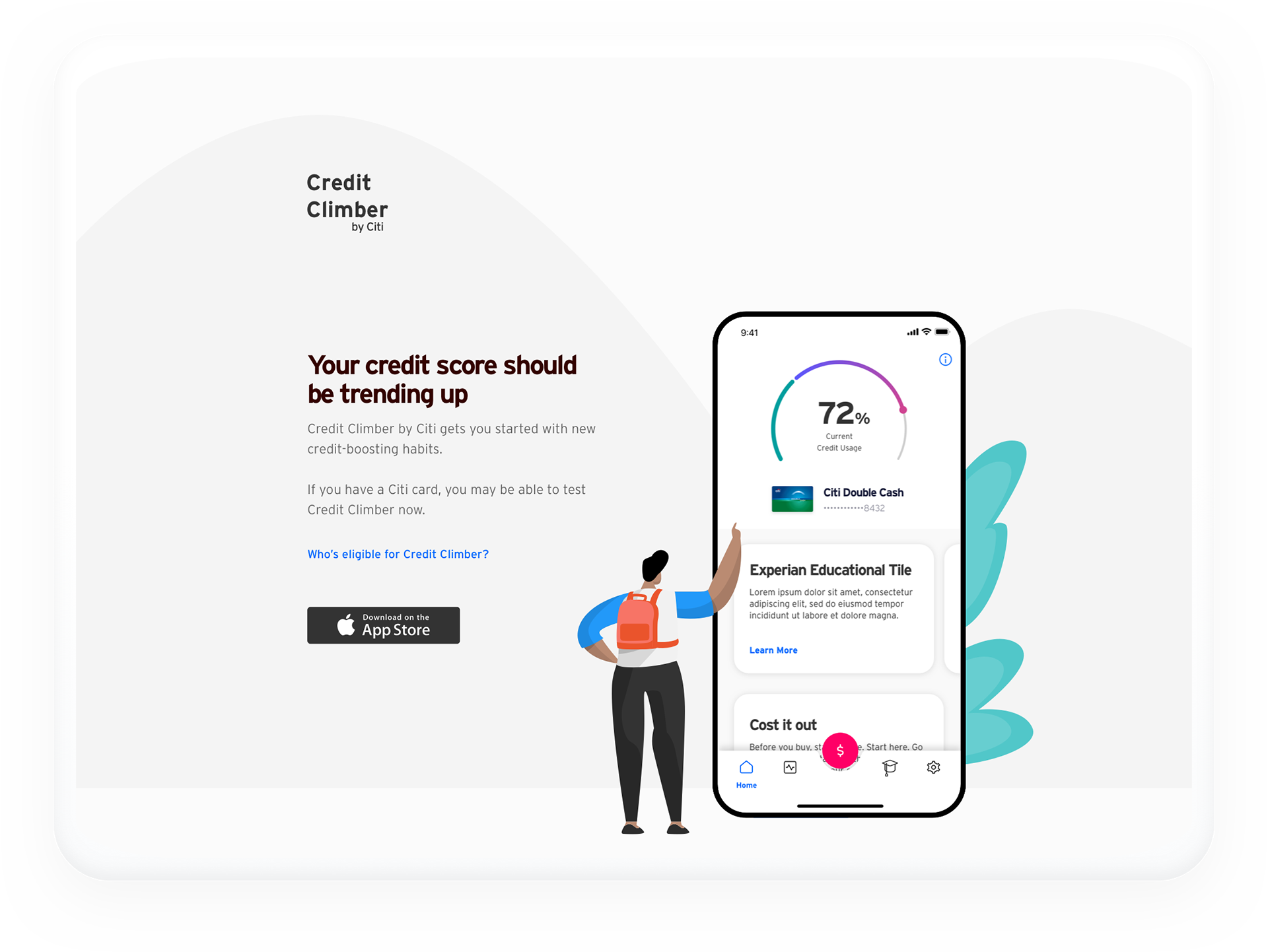 Front-end development in Angular and SASS for single-page application landing for the Credit Climber app by Citi. Fully responsive, utilizing Citi Design System components with Lottie animation integration.